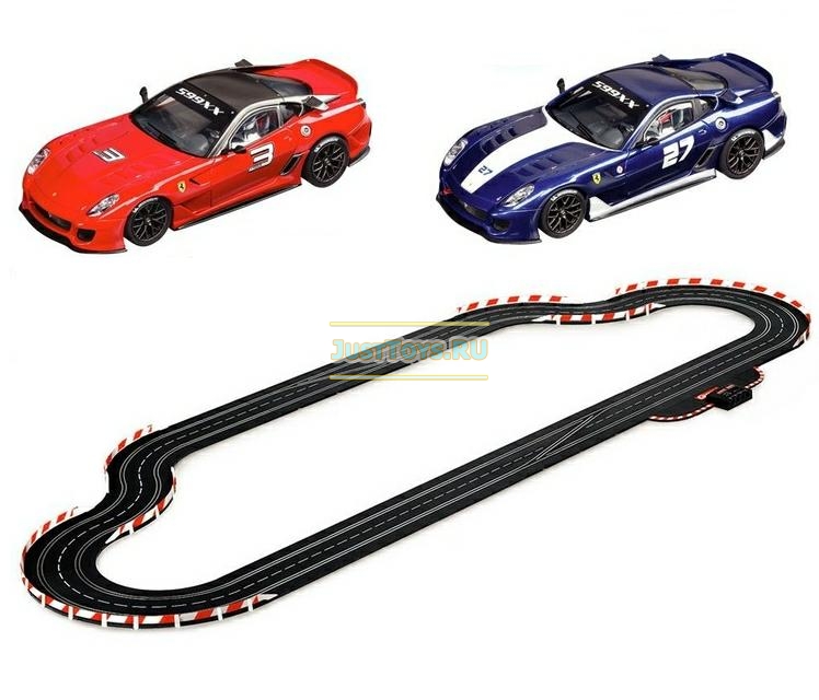 - 1 машинка Ferrari 599XX "Homestead 2010" - 1 машинка Ferrari 599XX "As seen at Geneva Motorshow" - 6 стандартных прямых деталей трека - 1 деталь, соединяющая трек с Black Box - 10 поворотов в 60 градусов - 2 цифровых 132-скоростных пульта управления - защитное ограждение - доп. детали - инструкция