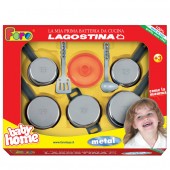 Качественный игровой набор посуды с эффектом хрома включает: кастрюля, сковорода: 2 шт, сотейник: 2 шт, крышка, лопатка для жарки, половник.