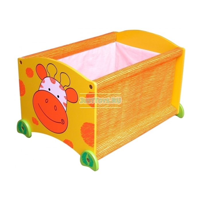 Ящик безопасен даже для самых маленьких детей, благодаря своей устойчивой конструкции с закругленными углами. На торцевой стеночке изображена улыбающаяся мордашка Жирафа, боковые стеночки – матерчатые, внизу – маленькие ножки-лапки.