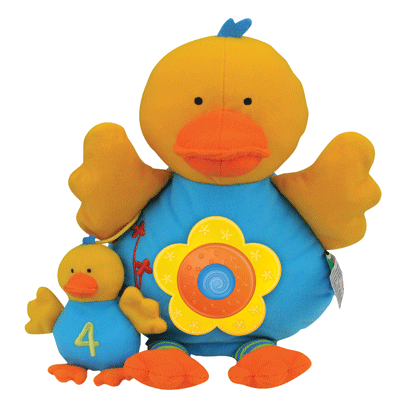Святящаяся интерактивная кнопка, расположенная на животе утёнка, поощряет любопытство малыша различными звуками.